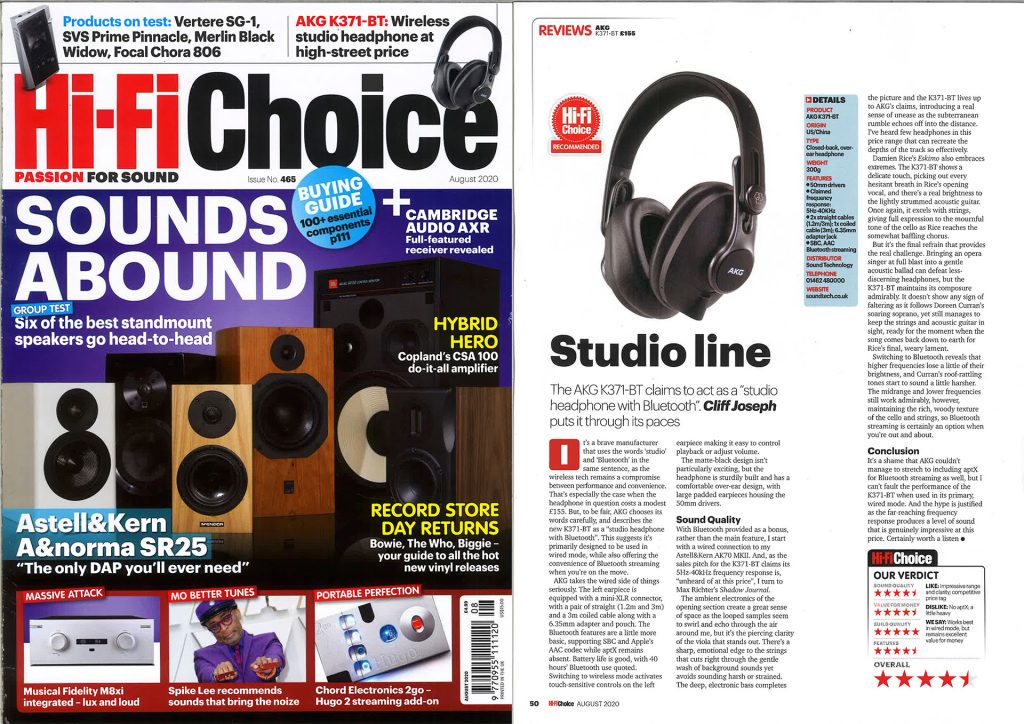 The AKG K371-BT receives an excellent review in the latest issue of Hi-Fi Choice. Hi-Fi Choice is one of the world’s most highly respected audio review titles and its ‘Recommended’ award goes only to products that it feels ‘meet a high standard of performance’.